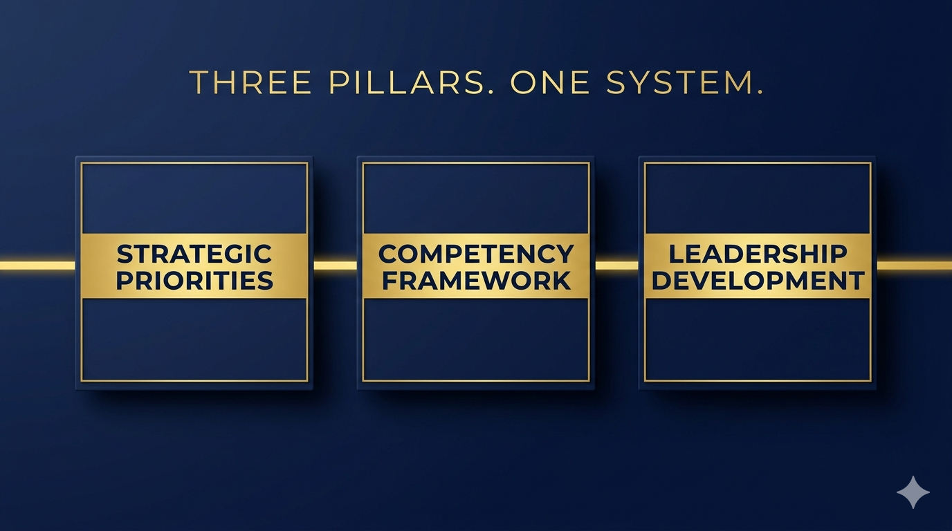 The three pillars every leadership system needs—strategic priorities, competency framework, and leadership development—and why they have to reinforce each other.